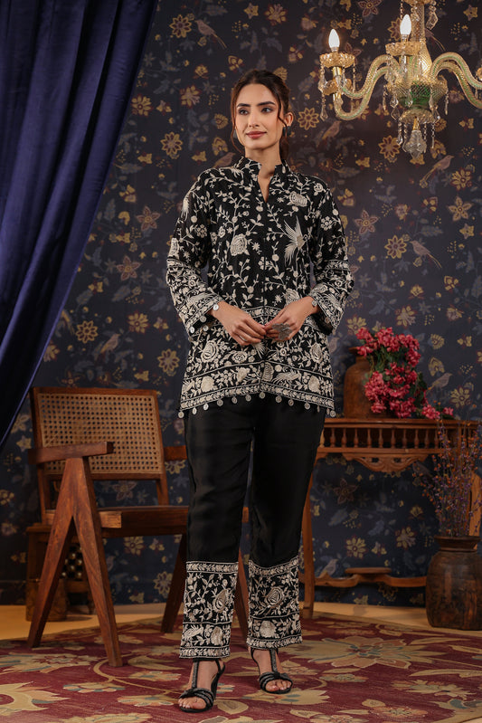 SummerFalling-Black Embroidered German Silk Co-Ord Set
