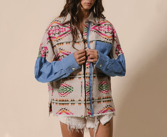 Multi Colored Aztec Printed Denim Jacket With Polished Hem