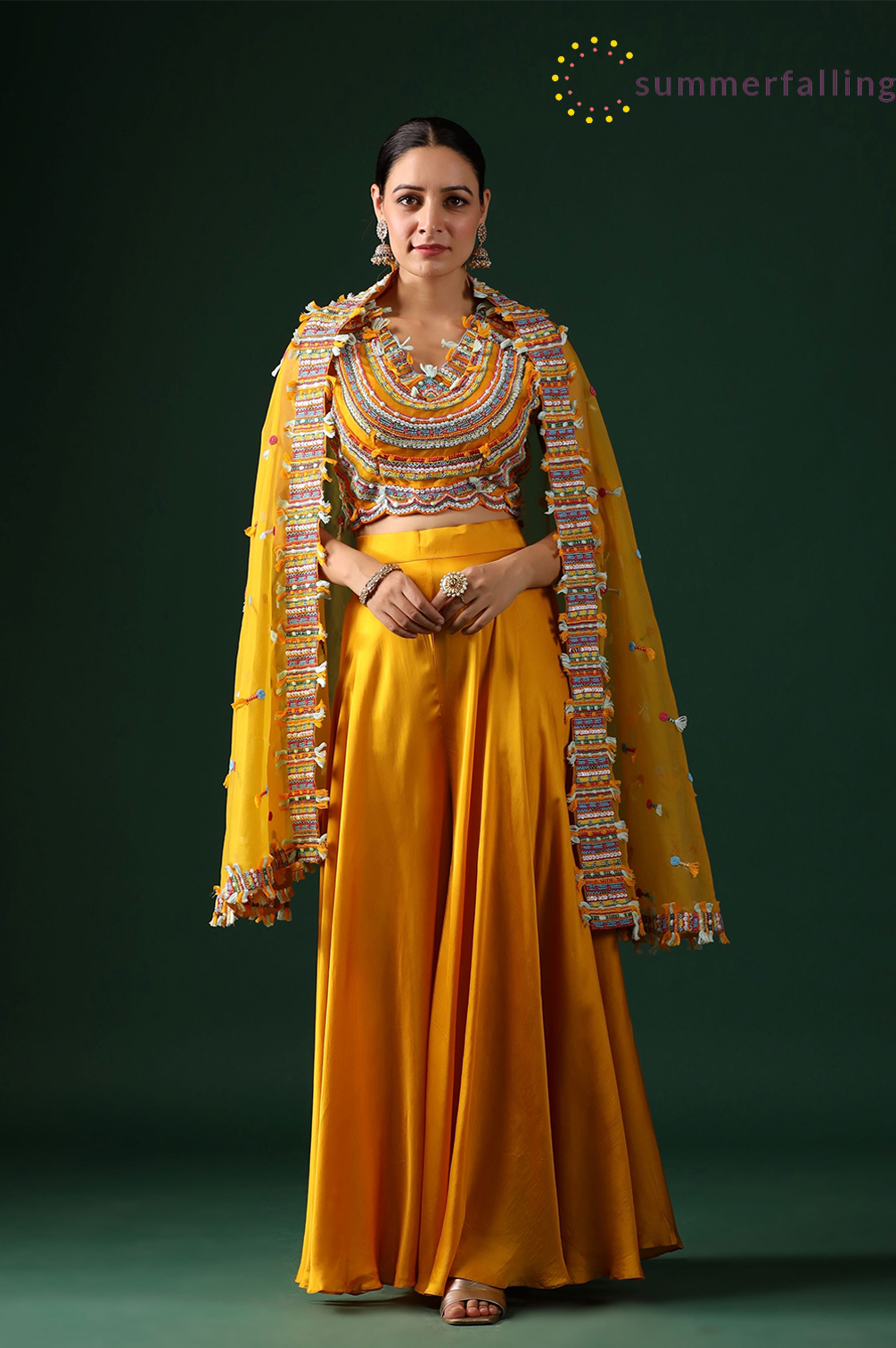 Amber yellow intrinsic bead handwork embroidered organza silk padded crop top. Comes with matching flared satin silk palazzo and premium organza silk cape. Apt for semi formal wear.