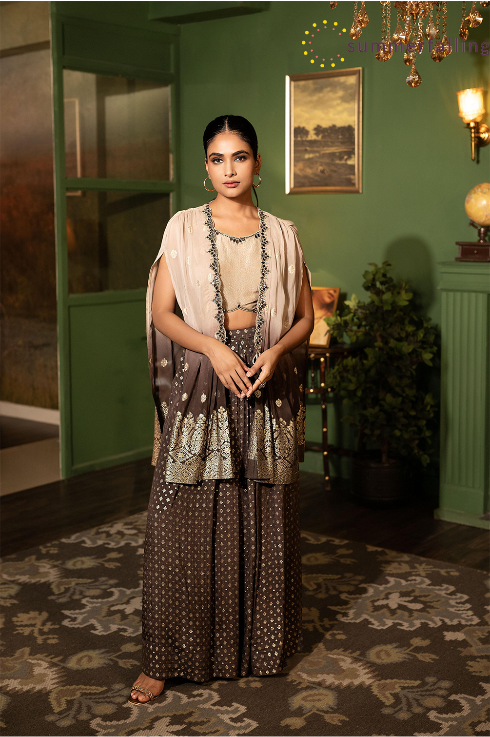 Ash brown ombre dyed premium silk cape. Crafted with sequin, zari and bead handwork embroidery. Paired with matching pastel cream crop top and sequin embellished crystal georgette silk palazzo. Apt for semi formal wear.