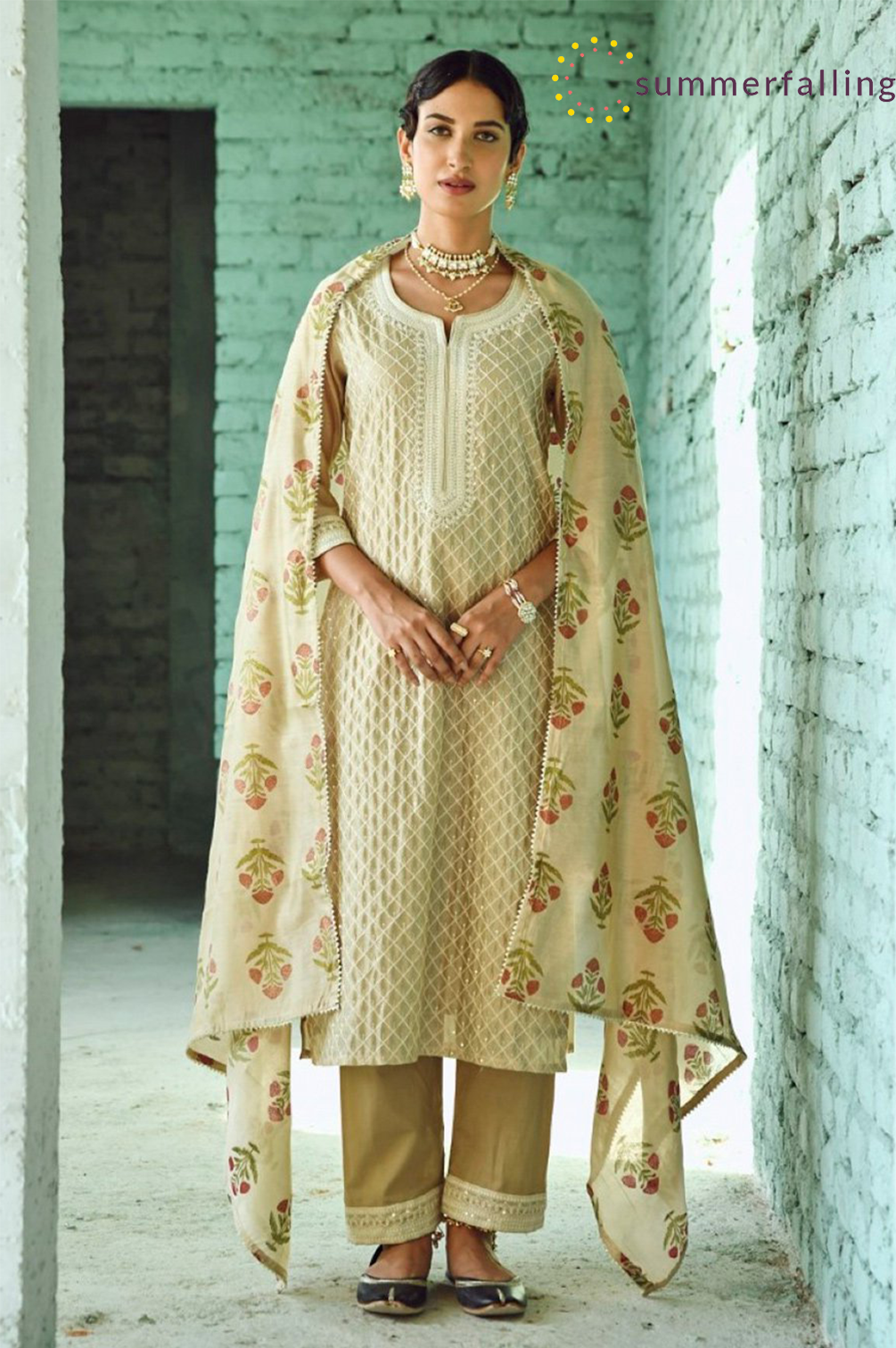 SummerFalling-Beige Embroidered Chanderi Silk Kurta Set