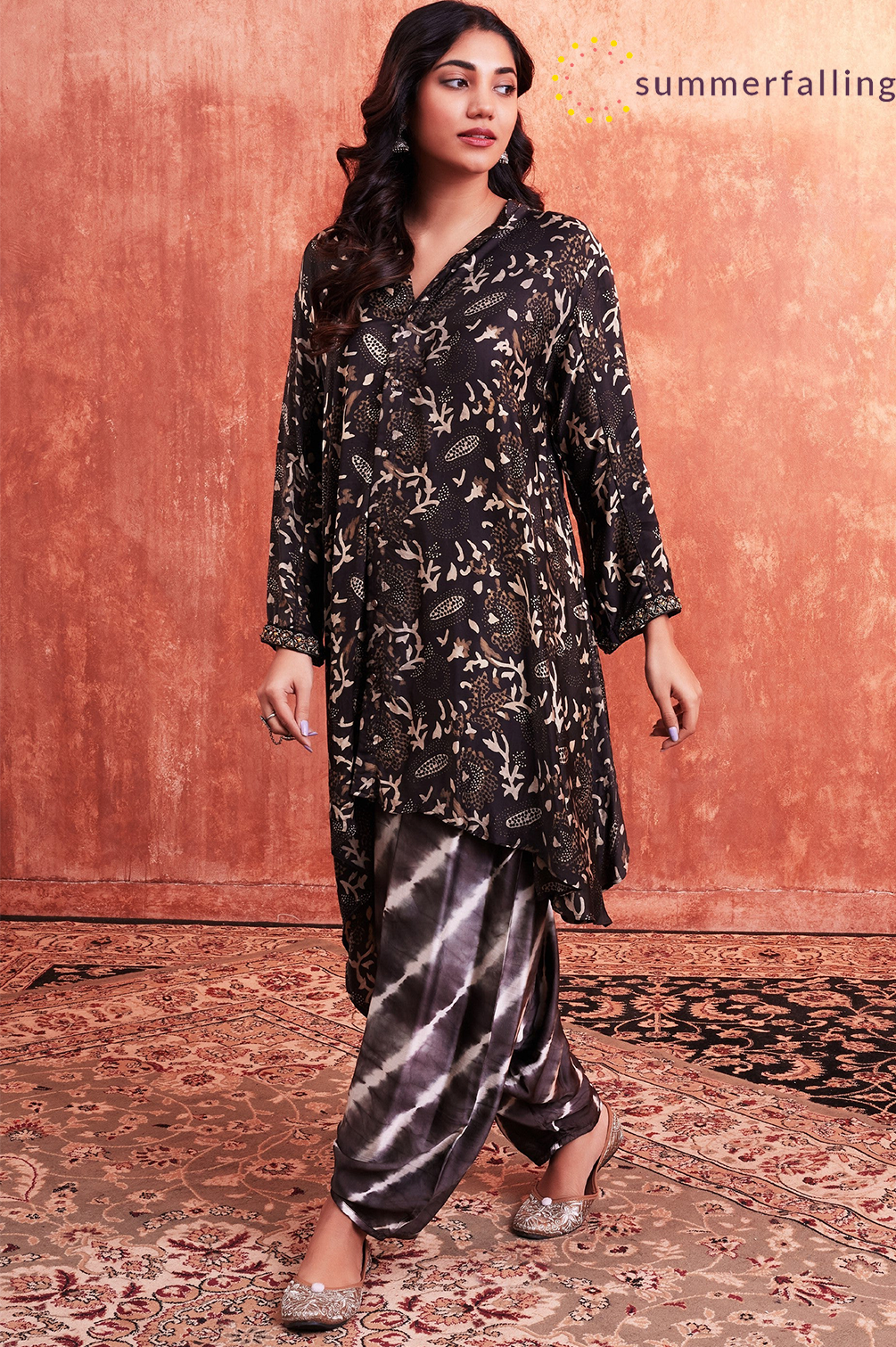 SummerFalling-Black Ajrakh Printed Habutai Silk Kurta Salwar Set