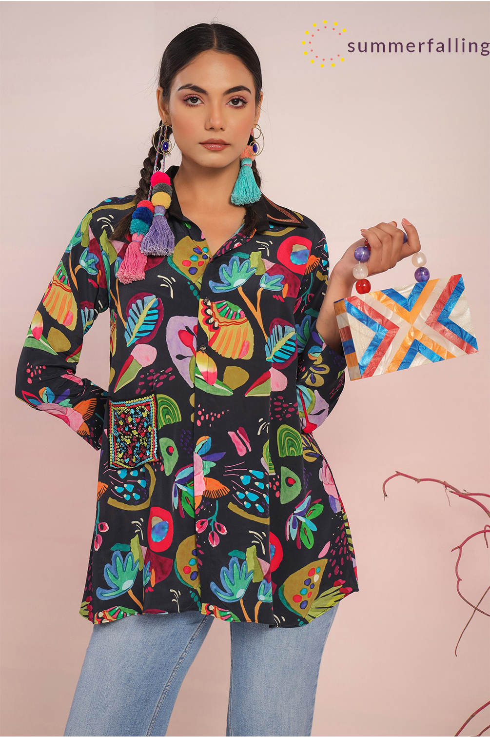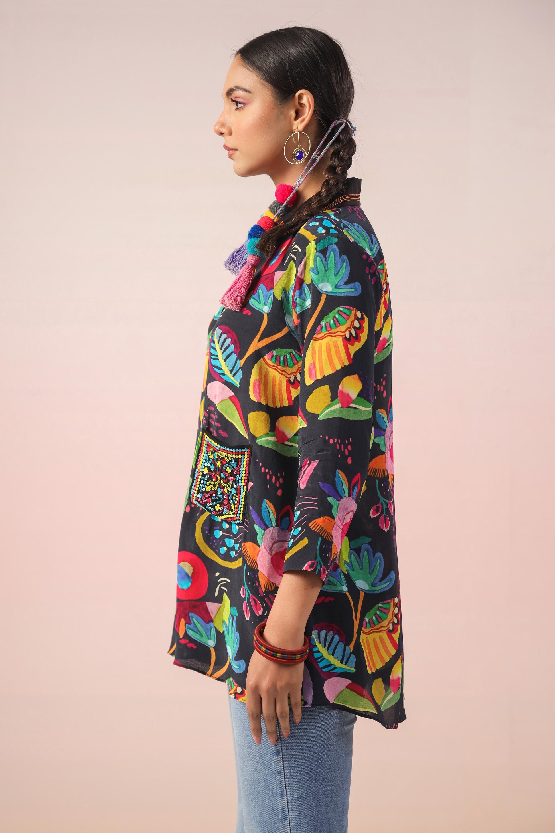 Black digital printed crepe silk short top, With sequin embellished pocket. Apt for casual wear.