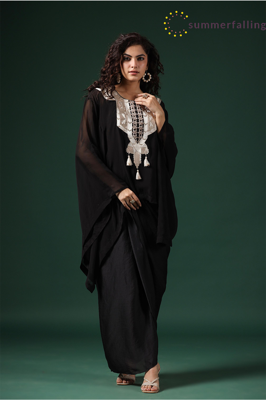 SummerFalling-Black Embellished Organza Silk Draped Skirt Set
