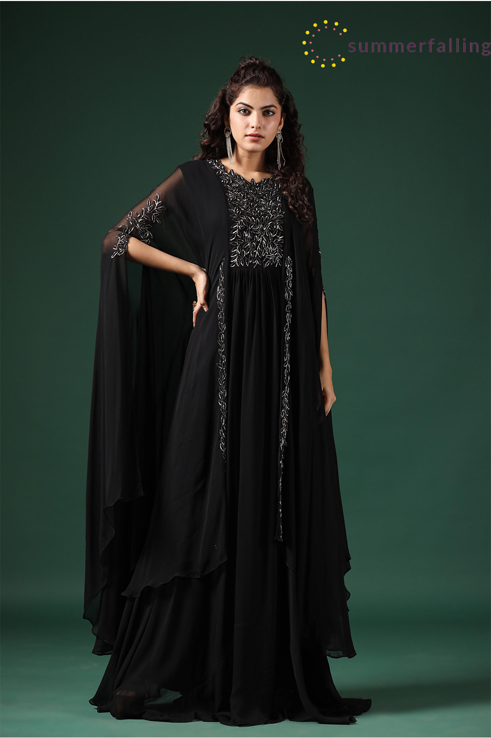 SummerFalling-Black Embellished Crystal Georgette Silk Cape Gown