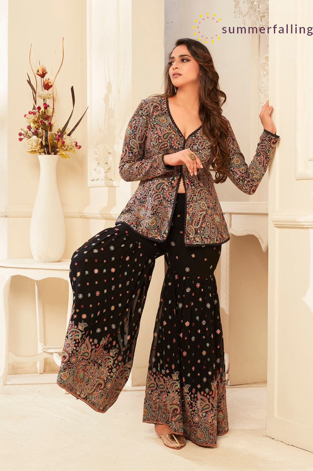 SummerFalling-Black Embellished Oasis Silk Cape Set.