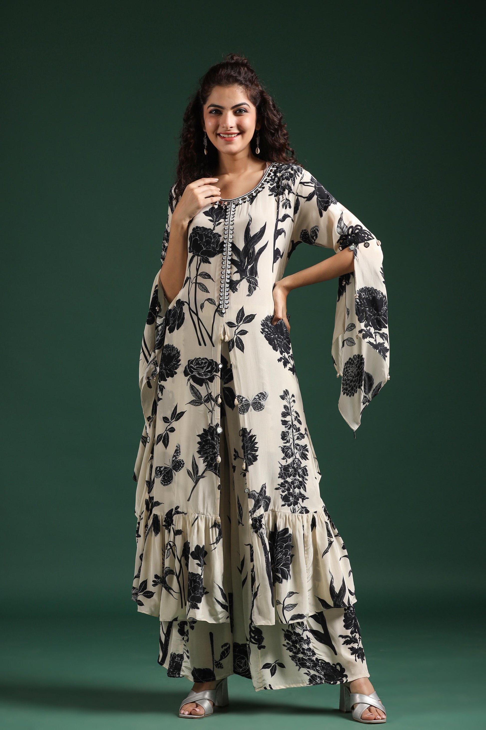 Black & White digital printed muslin silk kurta, Crafted with intrinsic sequin, bead, mirror and cut dana handwork embroidery, Styled with front high slit at the front of the kurta and sleeves. Also frills at the bottom of the kurta. Paired with matching flared palazzo. Apt for semi formal wear.