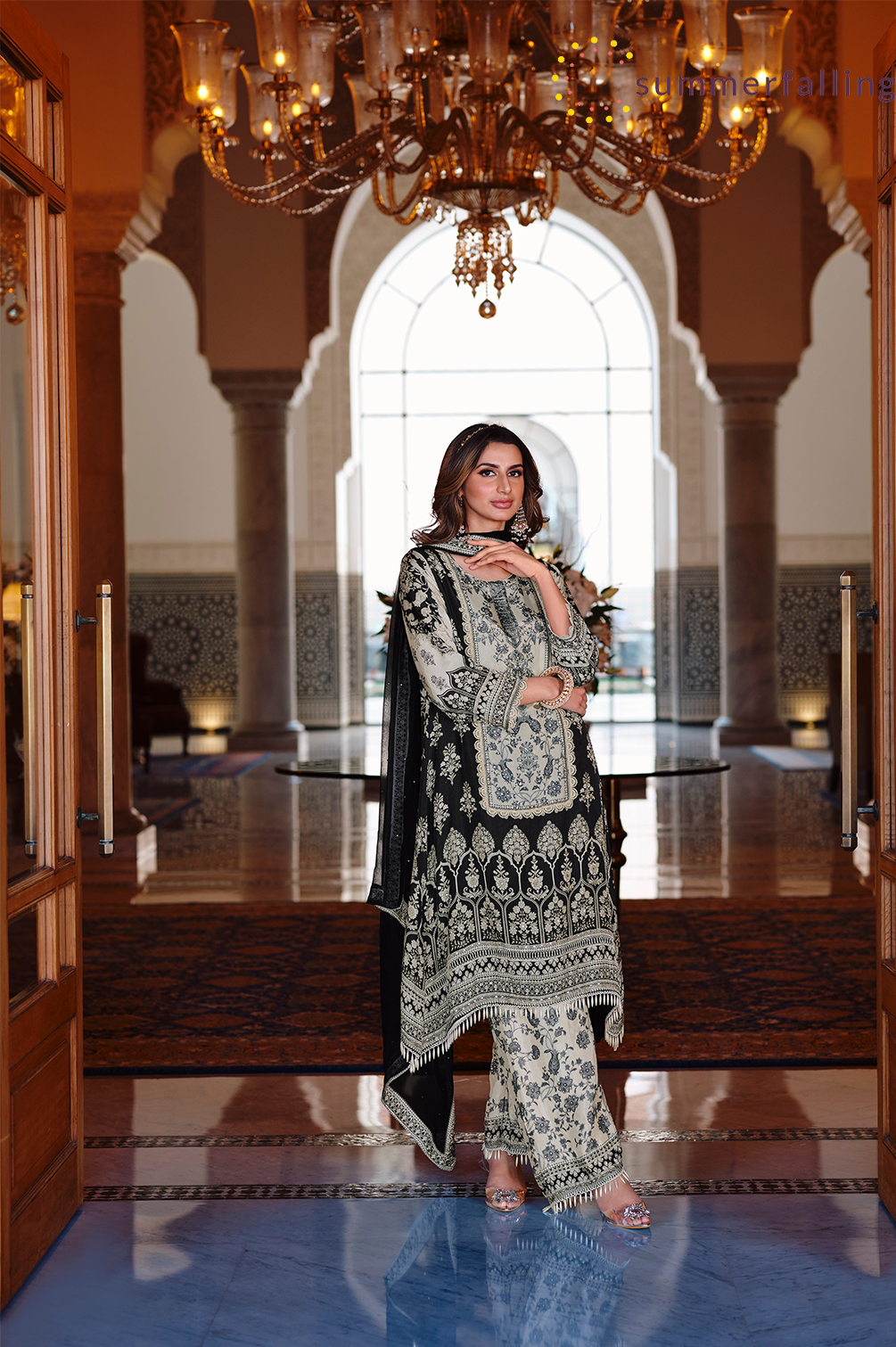 SummerFalling-Black & White Floral Printed Crepe Silk Palazzo Set