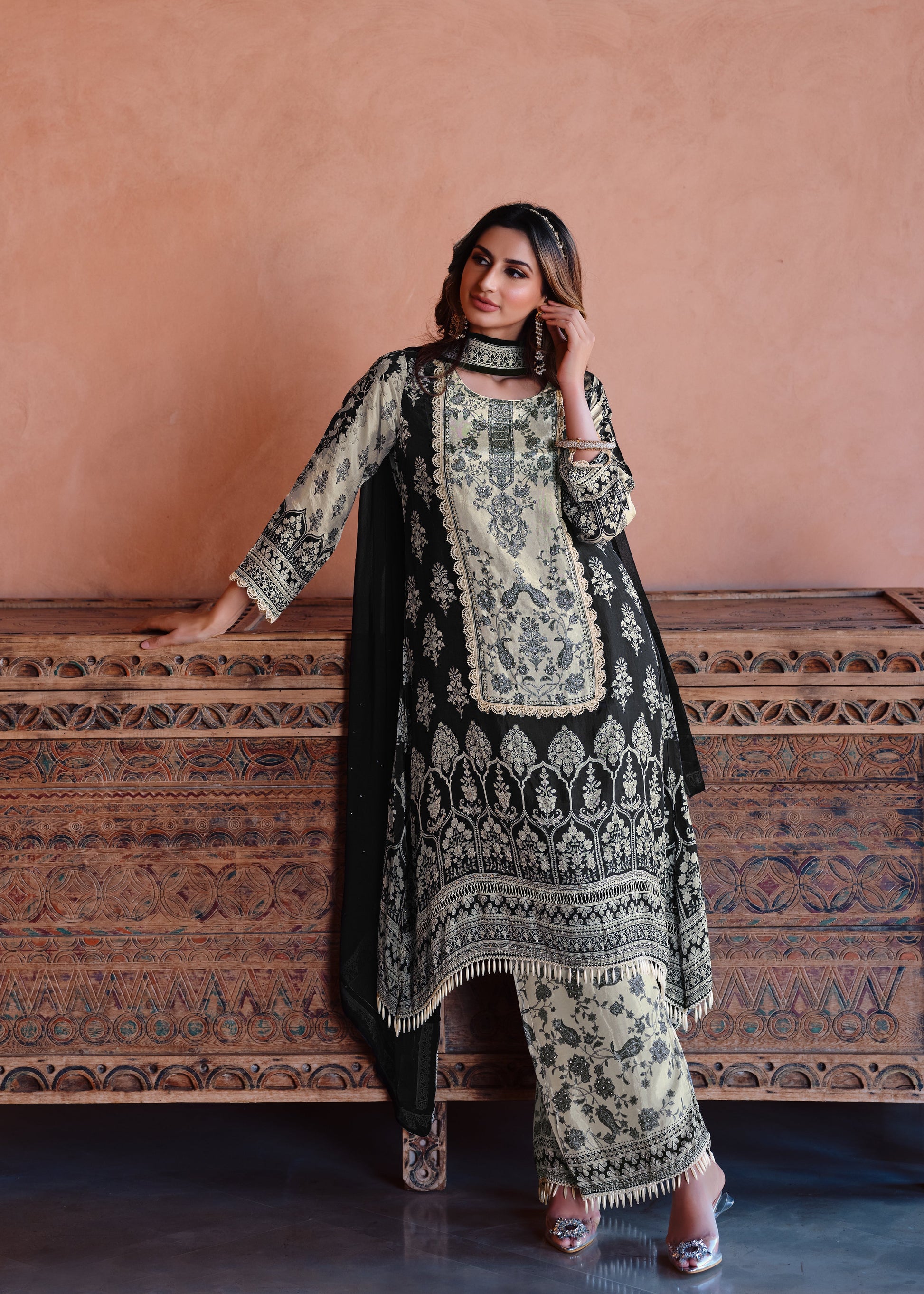 Black & white floral printed crepe silk asymmetrical kurta. Embellished with stone handwork. Paired with matching palazzo and dupatta. Apt for semi formal wear.
