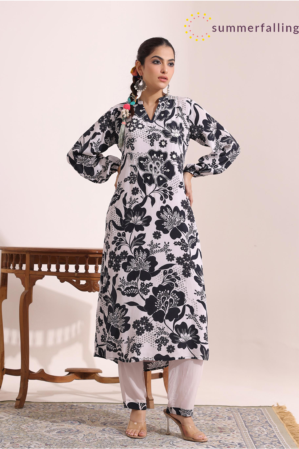 Black and white floral printed crepe silk straight kurti. Crafted with bead handwork embroidery. Paired with matching pants. Apt for semi formal wear.