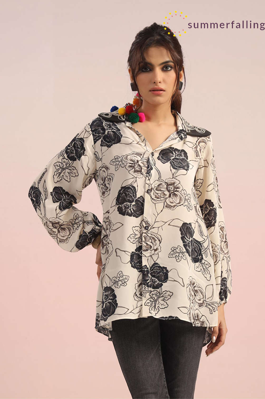 SummerFalling-Black & White Floral Printed Crepe Silk Short Top